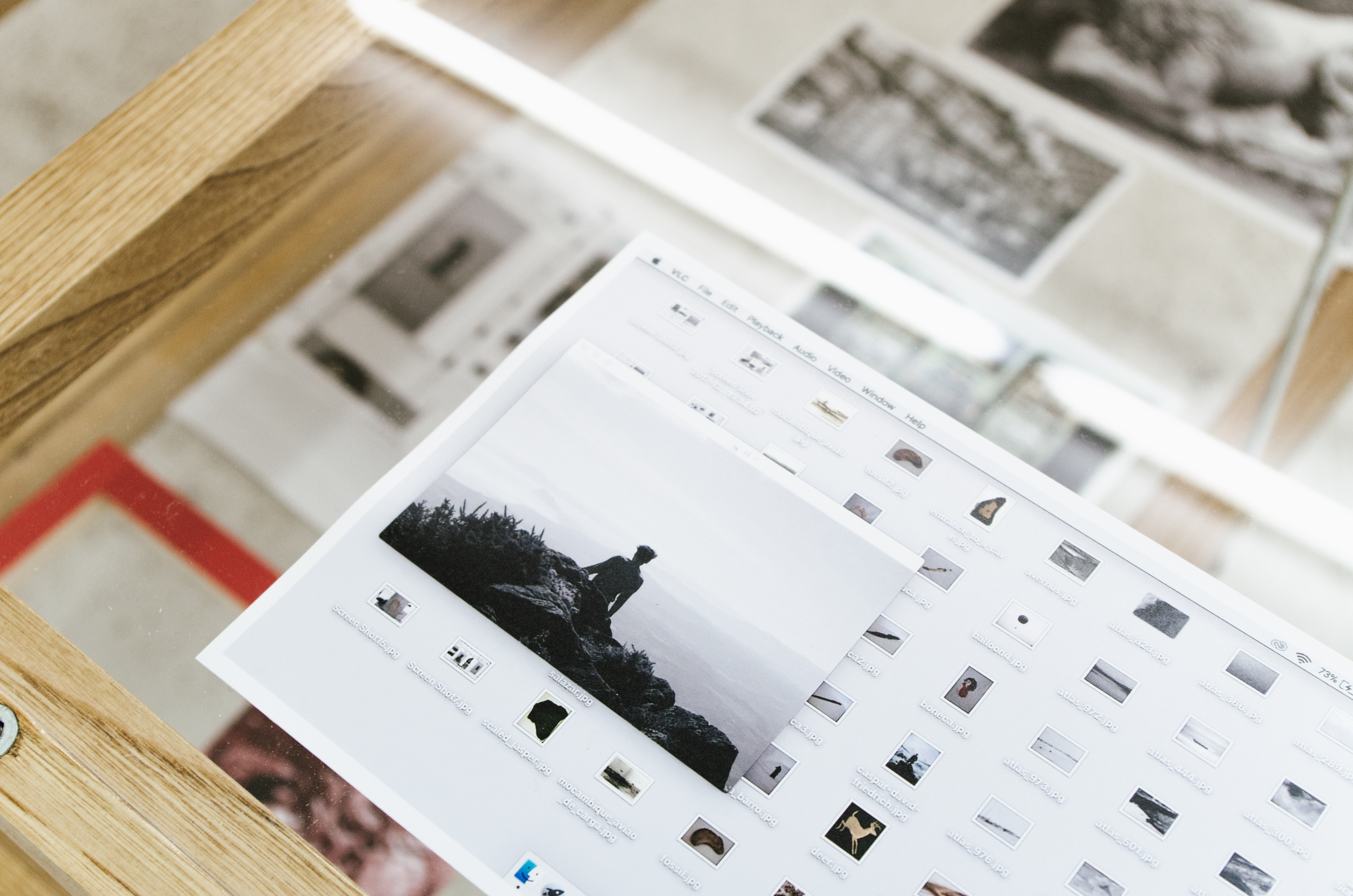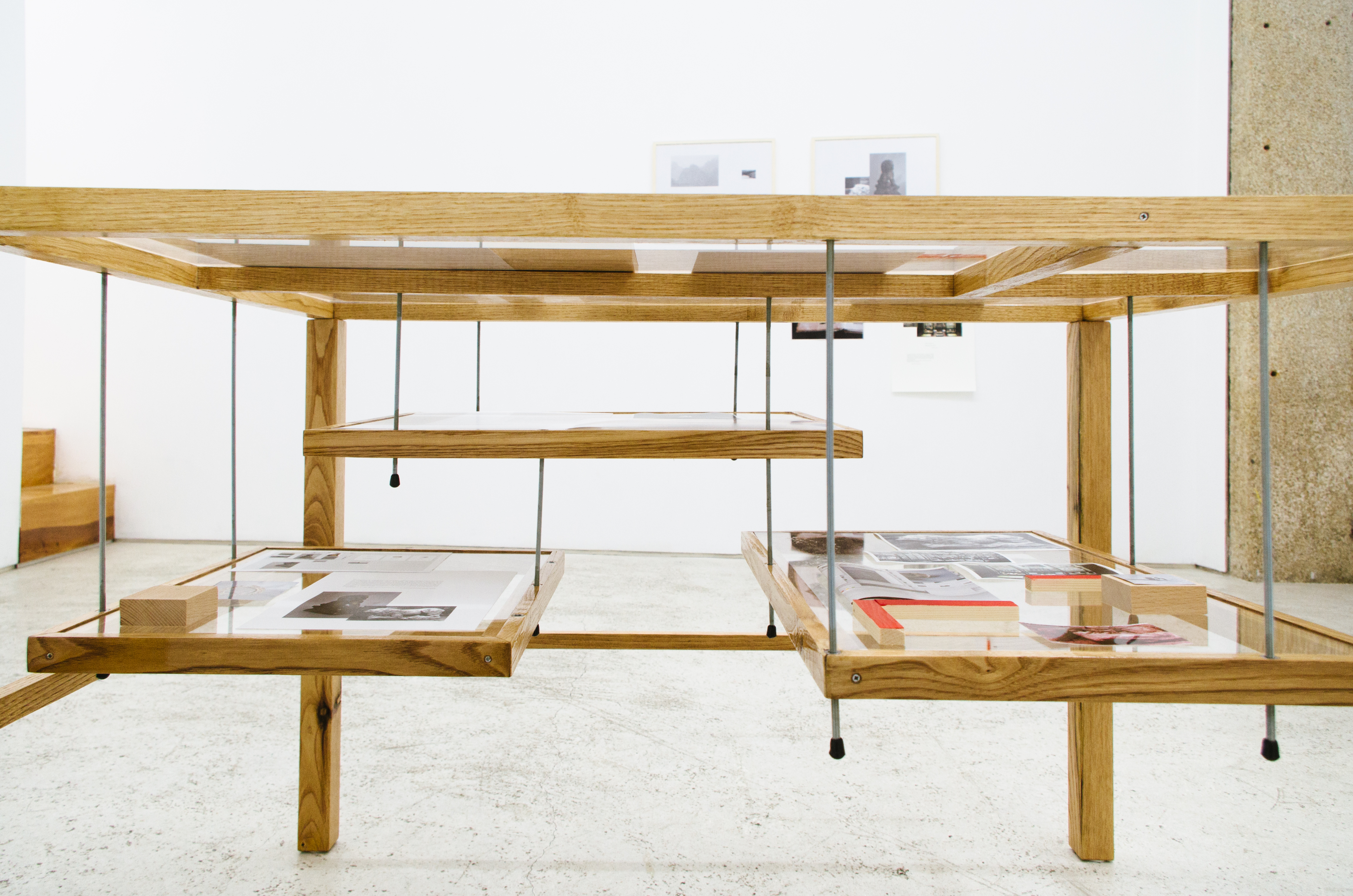 ‘Table for Thought: Cabinet of Constellations: How to tell the story of a gap?’; 2019; Montage table/Instalation of research elements: digital print on paper, lambda print, objects, wood pieces with red acrylic paint; 84 x 96 x 127 cm.